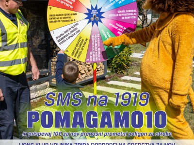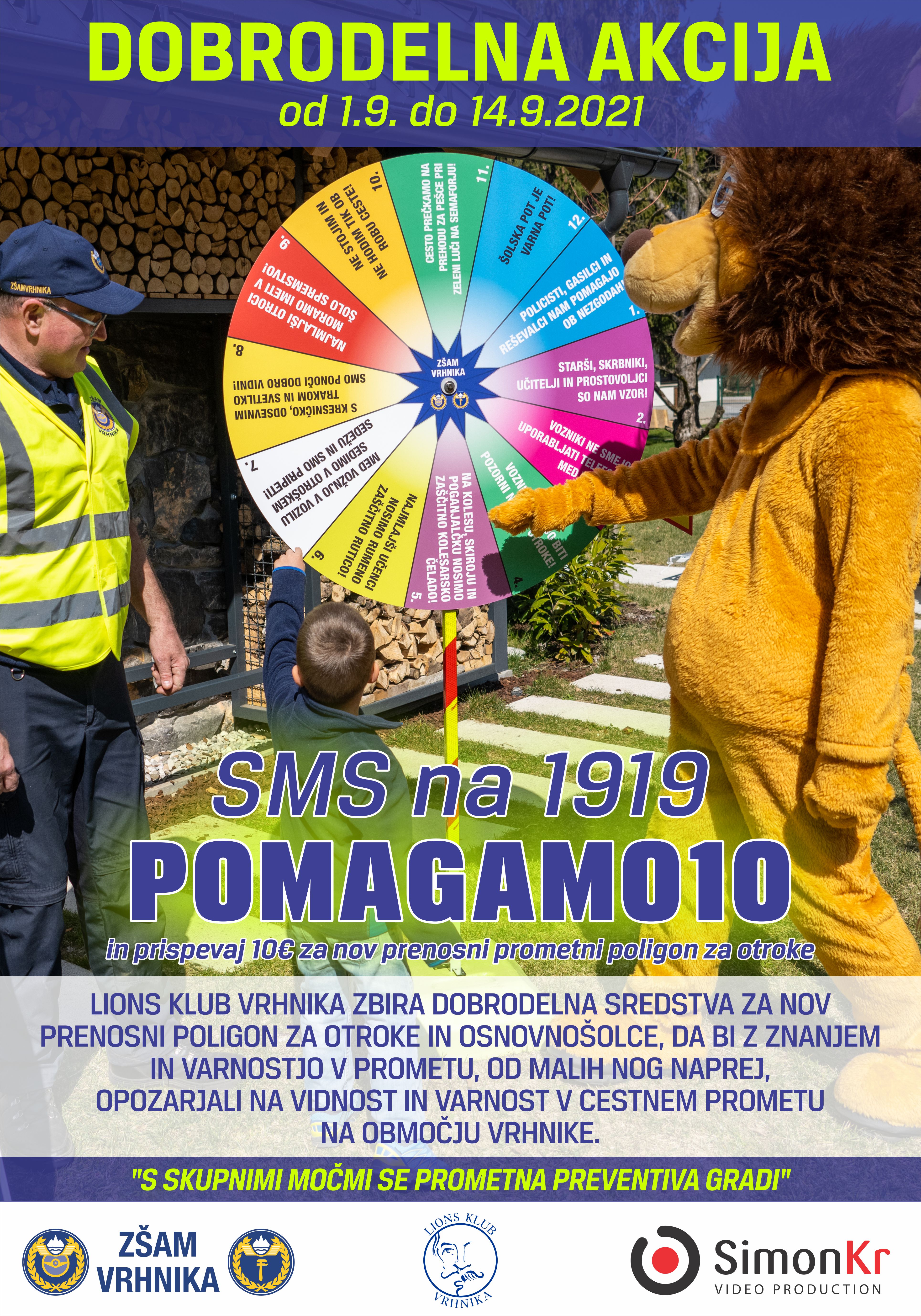 Pošljite sporočilo SMS s ključno besedo Pomagamo10 na številko 1919 in prispevali boste 10 EUR za za nov prenosni prometni poligon za otroke v okviru dobrodelne akcije aktivni za varnost otrok v prometu.