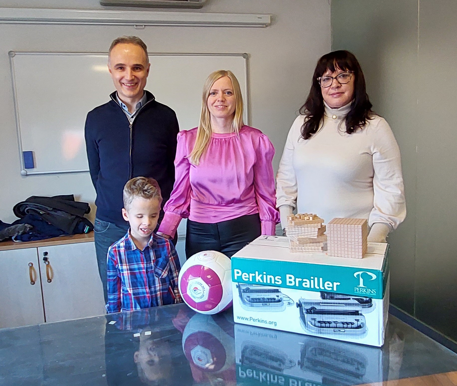 Marcel ima 7 let in je učenec prvega razreda. V prvi triadi osnovnošolskega izobraževanja je poudarek na opismenjevanju, ki pri slepem otroku poteka preko brajeve pisave. Za zapisovanje uporablja brajev pisalni stroj in se uči branja s pomočjo gradiva, prilagojenega v brajico. Da bo Marcelu lažje pri njegovem učenju, smo mu omogočili nov brajev pisalni stroj in komplet za učenje matematike, s katerim se lahko s pomočjo tipa uči o merskih enotah enica-desetica-stotica-tisočica ter zvenečo športno žogo.
